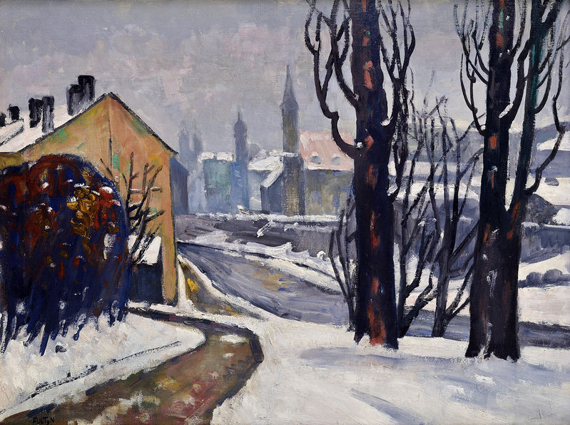€ 2 356,77,- Krajina od Nového Mesta na Morave. Okolo 1945. Olej na dreve. 22 x 33 cm. (78. jarná aukcia, 11. 3. 2008)