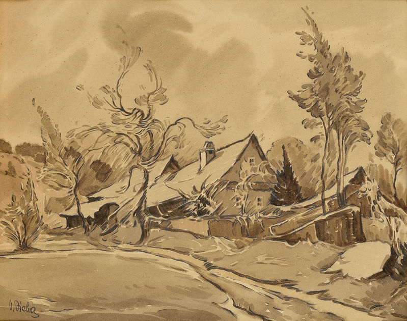 € 130,- Dedinka. Okolo 1940. Akvarel na papieri. 34 x 39 cm. (90. jarná aukcia, 9. 3. 2010)