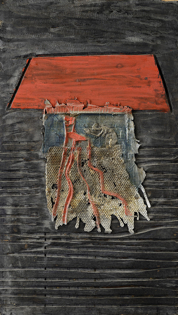 Technika: Asambláž, tempera na dreve