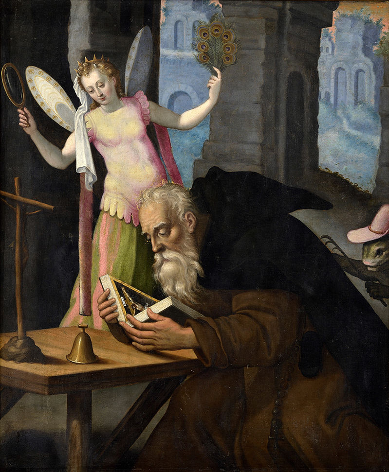je veľmi obľúbeným námetom maliarstva už od konca stredoveku. Tento námet sa objavuje v dielach mnohých významných umelcov, akými boli napr. Hieronymus Bosch, Pieter Bruegel st., ale aj medzi umelcami moderného umenia. Ponúkané dielo kompozične vychádza z manierizmu, zobrazuje svätca v okamihu, keď ho pokúša anjel (veľmi často má podobu krásnej ženy). Anjel drží v jednej z rúk zrkadlo - symbol svetskej pominutelnosi a v druhej pávie perá, ktoré znamenajú znovuzrodenie. Svätec rozjíma nad Písmom, ktoré patrí, spolu s krížom, medzi jeho základné atribúty. Tento námet prináša často zobrazovanie rozličných príšer a démonov, ktoré sú v tomto prípade redukované na jednu zoomorfnú bytosť. Napriek tomu, že po formálnej stránke obraz vychádza z manierizmu, je kompozícia zjednodušená a postavám chýba väčšia dynamika. Autor obrazu vychádzal z podnetov nizozemskej tvorby, najmä grafickej produkcie druhej polovice 16. storočia.