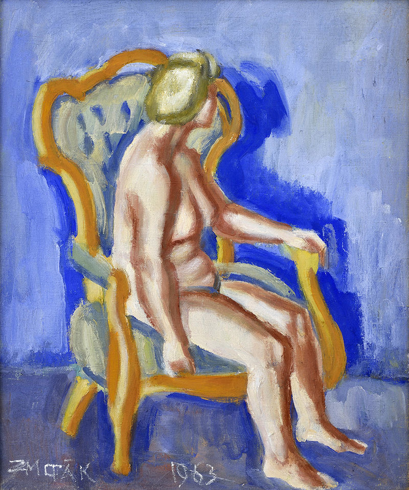 Popis: „Akt v barokovom kresle“ je vynikajúcim dielom zrelej maľby Ernesta Zmetáka. Parížska picassovská iniciácia, rozhodujúca pre jeho vrstovníkov, má pre neho pramalú dôležitosť. Oveľa inšpiratívnejšia, ba v určitom zmysle i zlomová bola pre Zmetáka cesta do Talianska roku 1947. Je vôbec príznačné, že periodizácia Zmetákovho maliarskeho vývinu sa zvykne určovať nie podľa jeho štýlových premien, ale skôr v závislosti od miestopisu jeho výtvarných pobytov. V Ríme študuje Masacciove fresky a Cavalliniho mozaiky, maľuje v prístave Capri. Prvá Zmetákova talianska cesta mala však aj istý metaforický význam. Do Ríma prichádza akoby v šľapajách svojho učiteľa, aby z vlastnej skúsenosti spoznal ním toľko obdivovaných umelcov talianskej renesancie. Zmeták si však od začiatku, so zvláštnou neomylnosťou, volil zúženejší priezor podnetov: pred maliarmi vrcholnej renesancie dával prednosť umelcom quatrocenta, Masacciovi, Uccellovi, Castagnovi, Mantegnovi, ale nadovšetko Giottovi. Nemohlo to byť ani inak. Rovnako ako v novodobej maľbe i v jej historickej minulosti hľadal Zmeták vždy oporu skôr v príkladoch čistoty zmyslového maľovania, než v exhibíciách jeho výlučnej artistnosti.