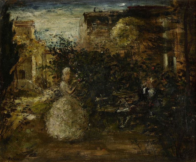 je zberateľsky zaujímavým dielom významného maďarského modernistu Lajosa Gulácsyho. Podľa posudku dr. Gábora Beláka: „... kompozícia predkladaného obrazu obsahuje v popredí stojace figúry a v druhom pláne sa nachádza obrys architektúry mesta. Gulácsy použil podobné princípy kompozície už pri maľbe diela „Don Juan“ deponované v Múzeu Rippl-Rónaia. ... takto komponované diela sú preňho príznačné... . Jeho štýl maľby nie je jednoznačne identifikovateľný, keďže podlieha rôznym zmenám. V jednej časti maľbu nanáša pastózne a jeho rukopis možno charakterizovať ako delený, v iných častiach predstavuje maľba iba tenkú vrstvu aplikovanú splývavým rukopisom. Takýto rôznorodý prístup k technike maľby v rámci jedného obrazu je pre autora veľmi typický... Prírodné zátišie a kvety svojim výrazom determinujú dynamiku postáv a celú atmosféru diela. Za analógiu k prírodnej štafáži predkladaného obrazu možno považovať napr. dielo Ležiaca z roku 1908... Sivo - zelené odtiene a farebnosť akú má „Rokoková záhradná scéna“ je pre jeho diela charakteristická, podobne ako splývavé obrysy architektúry v pozadí figurálnych scén, ktoré nachádzame aj v dielach „Egy bizarr este“, či „Elmúlás“ deponované v Maďarskej národnej galérii. Podľa Dr. Gábora Belláka je „... veľmi náročné porovnávať Gulácsyho diela, keďže neexistuje kontinuita v dokumentácii jeho tvorby. Časť Gulácsyho tvorby sa nenávratne stratila počas vojnových konfliktov, ďalšia nie je dostatočne dobre zachovaná. Sám autor okolo svojej tvorby rád vytváral záhady a diela aj rozlične signoval.... predkladané dielo je autorovou prácou a možno ho datovať do roku 1910...“.