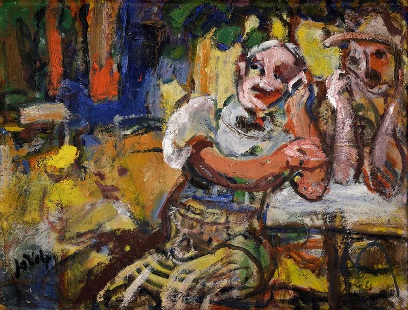 € 34 000 Ženy v kaviarni. Okolo 1955. Olej na kartóne. 29 x 45 cm. (109. jarná aukcia výtvarných diel, 19.03.2013)