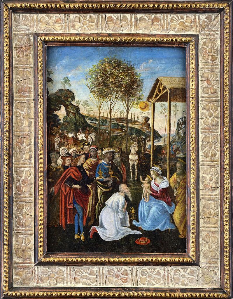 je dielom neznámeho florentského umelca z druhej poloviny 15. storočia. Mimoriadne zberateľsky vzácne dielo: kompozičné riešenie, výstavba priestorového rozvrhnutia celej scény radí túto prácu do okruhu umelcov, ktorí tvorili okolo velikána tohto obdobia Domenica Ghirladaia (1449 Florencia – 1494 Florencia). No nie je to len tento umelec, ktorý svojou tvorbou ovplynil autora predkladaného „Klaňania“. Ghirlandaio, vyučený aj ako zlatník, kládol veľký dôraz na kresbovosť a detail v maliarskej technike. Toto svoje úsilie zužitkoval i na veľkých feskách v Sixtínskej kaplnke. Rovnaký vplyv na drobnopisné a výrazne graciózne zobrazenie postáv a detailov mohlo autorovi nášho obrazu sprostredkovať i poznanie prác Sandra Botticelliho (1445 - 1510). Pre spôsob, akým sú maľované tváre, vlasy a detaily odevov je poznanie týchto dvoch maliarov viac než isté. Vzhľadom na subtílnosť práce, ako aj pomerne rozsiahle poškodenia a lokálne premaľby, bude nateraz ťažké bez chemických analýz bližšie určiť autora tejto drobnej tabuľovej maľby. Každopádne treba spomenúť ešte jedného z maliarov florentskej renesancie 15. storočia, ktorý mohol mať priamy vplyv na autora našej kompozície. V hľadaní priestorového členenia obrazovej plochy, v rozvinutí priestoru smerom do hĺbky pomocou serpentín ciest, po ktorých sa krajinou približuje sprievod troch kráľov možno nájsť veľmi blízku paralelu k freskám Sprievodu a Klaňania troch kráľov Benozza Gozzoliho (okolo 1421 - 1497) a to pri výzdobe kaplnky Medicejovcov Riccardovcov vo Florencii z roku 1459. Postroje koní, bohatosť oblečenia dvoranov, detaily vegetácie, to všetko sa, hoci v zredukovanej podobe, objavuje i na našom obraze. Obraz možno datovať do poslednej tretiny 15. storočia. Dominantným pre celý výjav je predný plán, na ktorom sa odohráva pri subtílnej drevenej stavbe celý výjav klaňania. Mária s Jozefom sú, na rozdiel od ostatných postáv, namaľovaní v klasických, antikizujúcich odevoch, a to spoločne s postavou adorujúceho kráľa. Ich tváre sú štylizované a oprostené od akéhokoľvek individualizmu, tak ako to vyžadovalo súdobé maliarstvo. Obraz by si zaslúžil chemicko-technologický prieskum, ktorý by napomohol na jednej strane spresniť datovanie, na strane druhej potvrdiť autorstvo niektorého z florentských maliarov (Zuzana Konopásková).