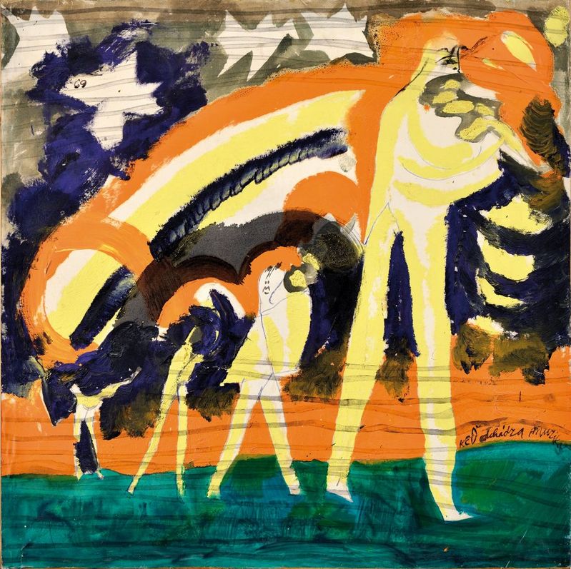 € 6 800 Spáč. 1968. Kombinácia techník na sololite. 3 segmenty: 114 x 79 cm, 70 x 109 cm, 39 x 35 cm. (116. večerná aukcia, 08.04.2014)