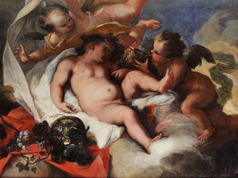 € 233 840 Putti držiaci drapériu. Olej na dreve.. 111,2 cm x 74,3 cm. Londýn 2016