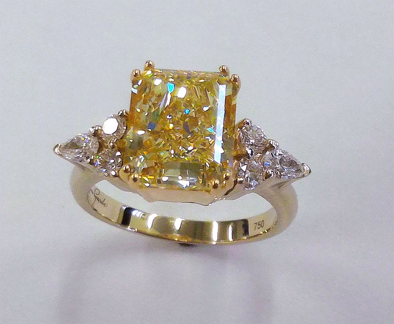 Technika: 18 kružové a biele zlato, centrálny diamant cca 6,02 ct, farba : natural fancy light yellow,radiant brus, kvalita VVS2, 6 ks diamantov spolu cca 0,70 ct, farba E-F, čistota VVS.