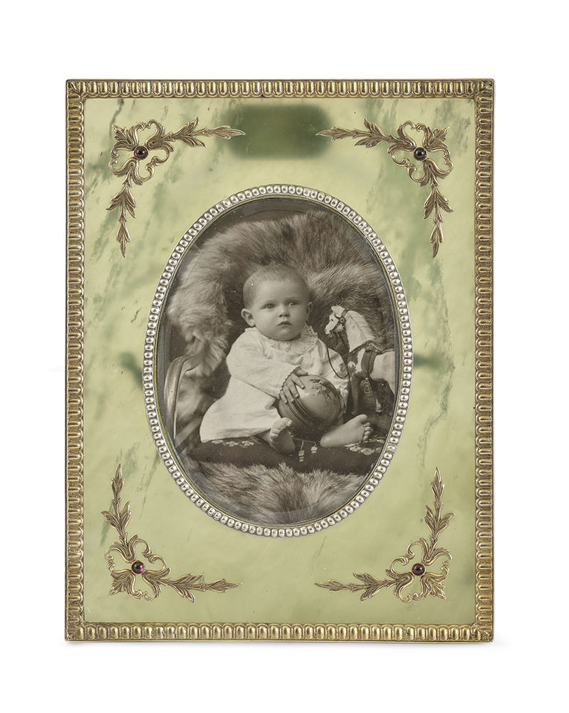 Technika: Zelený ónyx, pozlátený kov, striebro, diamanty,4 ks rubínov