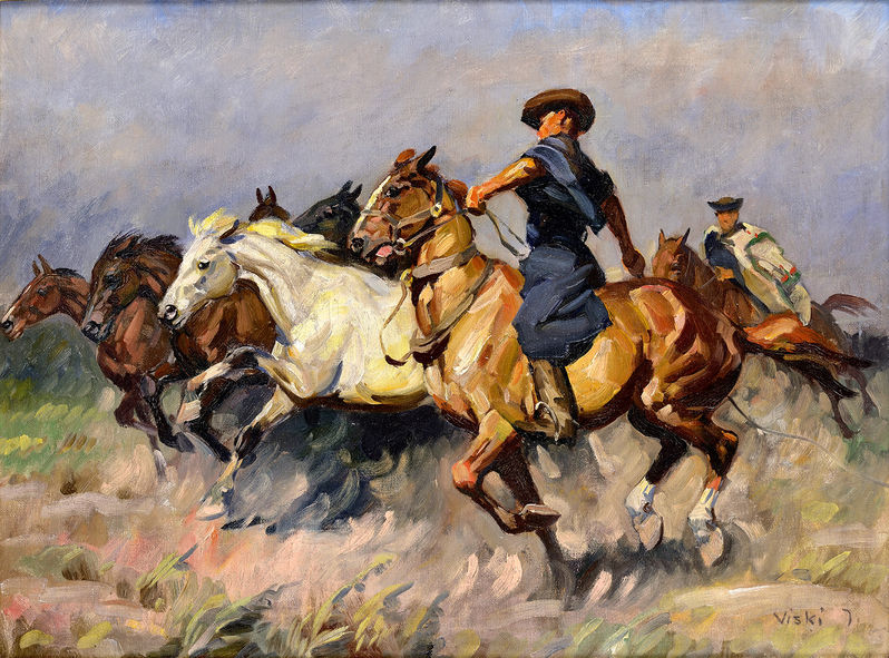 € 1 050,- Cválajúce kone na puste. Okolo 1930. Olej na plátne. 57 x 81 cm. (86. letná aukcia, 9. 6. 2009)