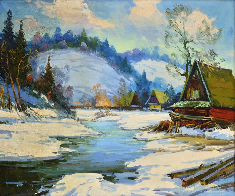 € 700,- Na rieke Uh. 1982. Olej na plátne. 74 x 79 cm. (95. zimná aukcia, 7. 12. 2010)