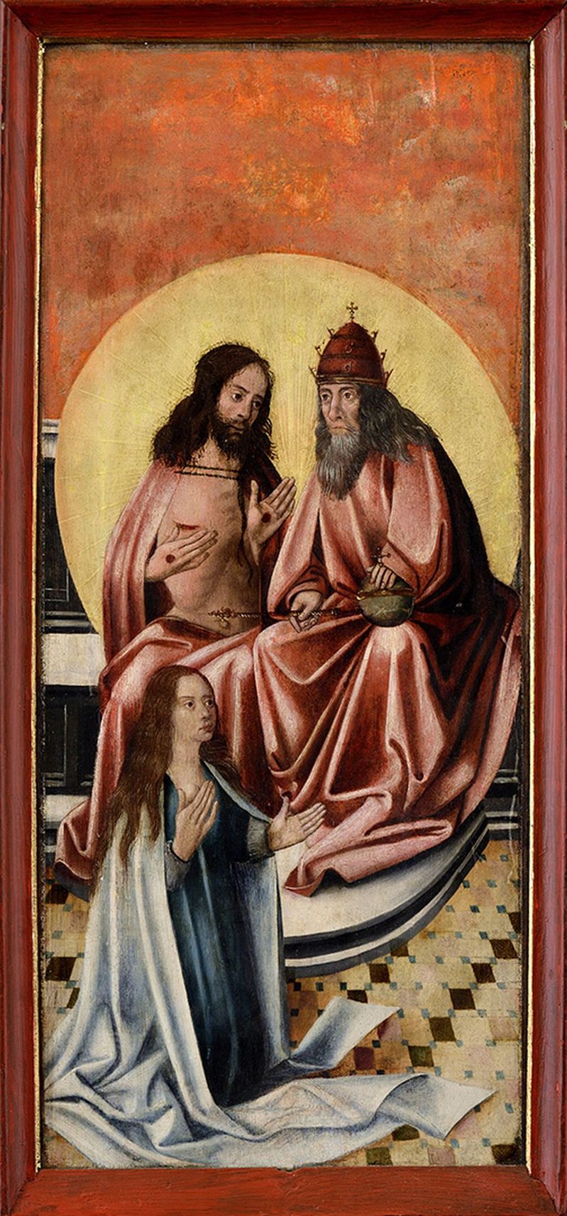 predstavuje ikonograficky ojedinelé zobrazenie Korunovácie panny Márie, ktoré je dôležitým momentom z cyklu života Márie, výjav nasledujúci po smrti Panny Márie a symbolizujúci víťazstvo nad smrťou. V hornej časti tabule nad Bohom otcom a Kristom, ktorí sedia na tróne pod nebeskou klenbou sú nepatrné pozostatky koruny, ktorú pravdepodobne niesla holubica. Na rozdiel od zvyšku tabule, ktorá sa dochovala v kompaktnej podobe, je táto časť tabule nezvratne poškodená, čo je škoda najmä pre následnú ikonografickú nečitateľnosť. Výjav je založený na apokryfnej literatúre. V 15. storočí sa pri zobrazovaní tejto témy mení starší typ zobrazenia. Mária už nesedí na tróne medzi Kristom a Bohom otcom, ale kľačí pred trónom v modlitbe, čakajúc na moment korunovácie. Mária má na sebe prehodený biely plášť, symbol čistoty a nevinnosti a celkom ojedinele je zobrazená v tejto téme s odhaleným prsníkom, ktorý poukazuje na jej materstvo. Obraz je maľovaný veľmi zručným autorom, čo je zrejmé nie len na postavách, ale aj v zobrazení celého priestoru scény a kompozičnom riešení obrazovej plochy. Obraz bol z najväčšou pravdepodobnosťou súčasťou marianského oltára a tvoril jedno z jeho krídel (Zuzana Konopásková, expert ARS LEGIS).