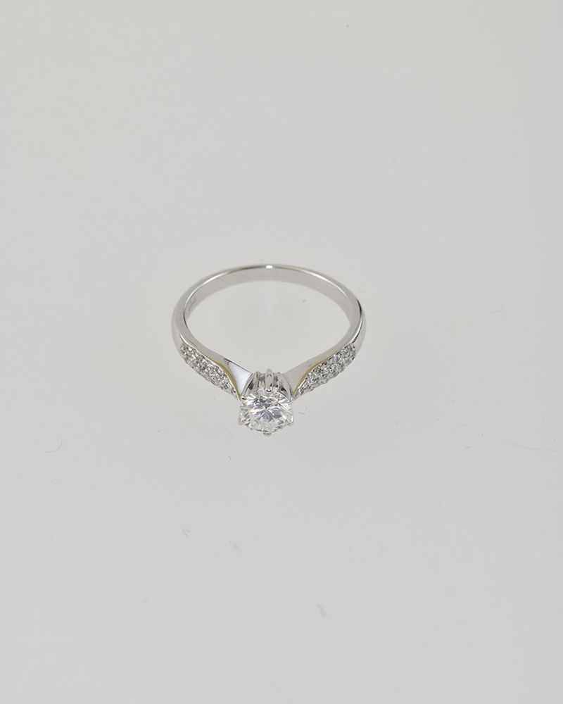 Technika: 18 k biele zlato, diamant centrálny solitér, 0,55 ct, farba F, čistota VVS1, bočné diamanty spolu cca 0,20 ct, farba F-G, čistota VS