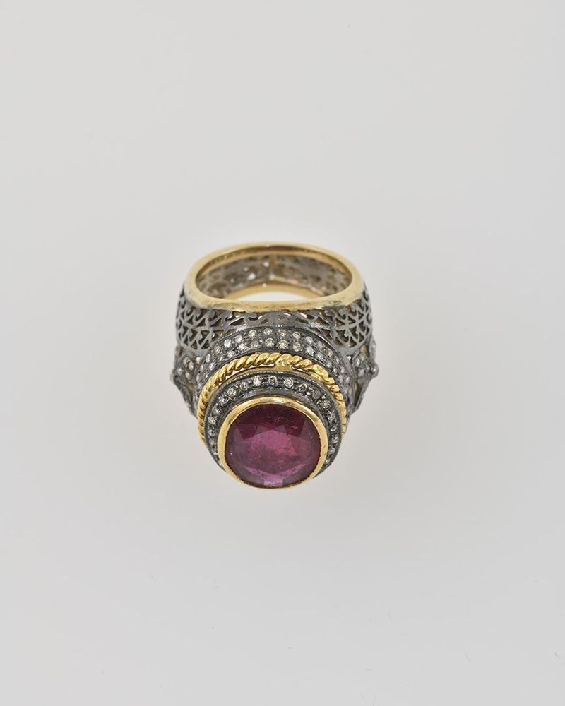 Technika: 14 k zlato, rubín cca 6,10 ct, diamanty spolu cca 0,75ct