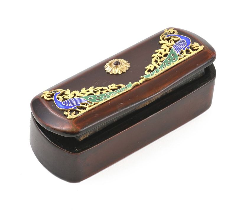 Technika: Mahagónové drevo, emailové aplikácie pávov, zdobené rubínmi