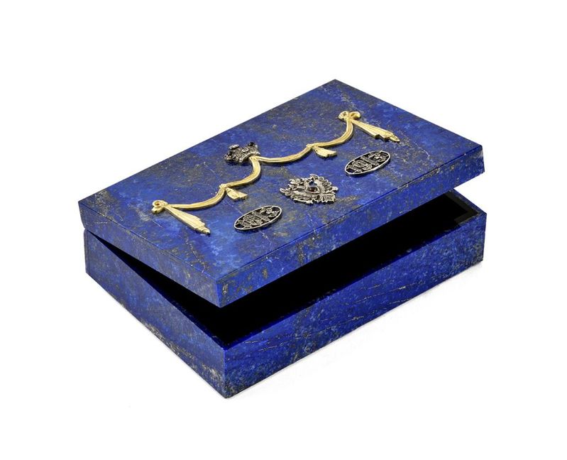 Technika: Kazeta s lapis lazuli, striebro, pozlátené striebro, diamantové šplitre, rubíny