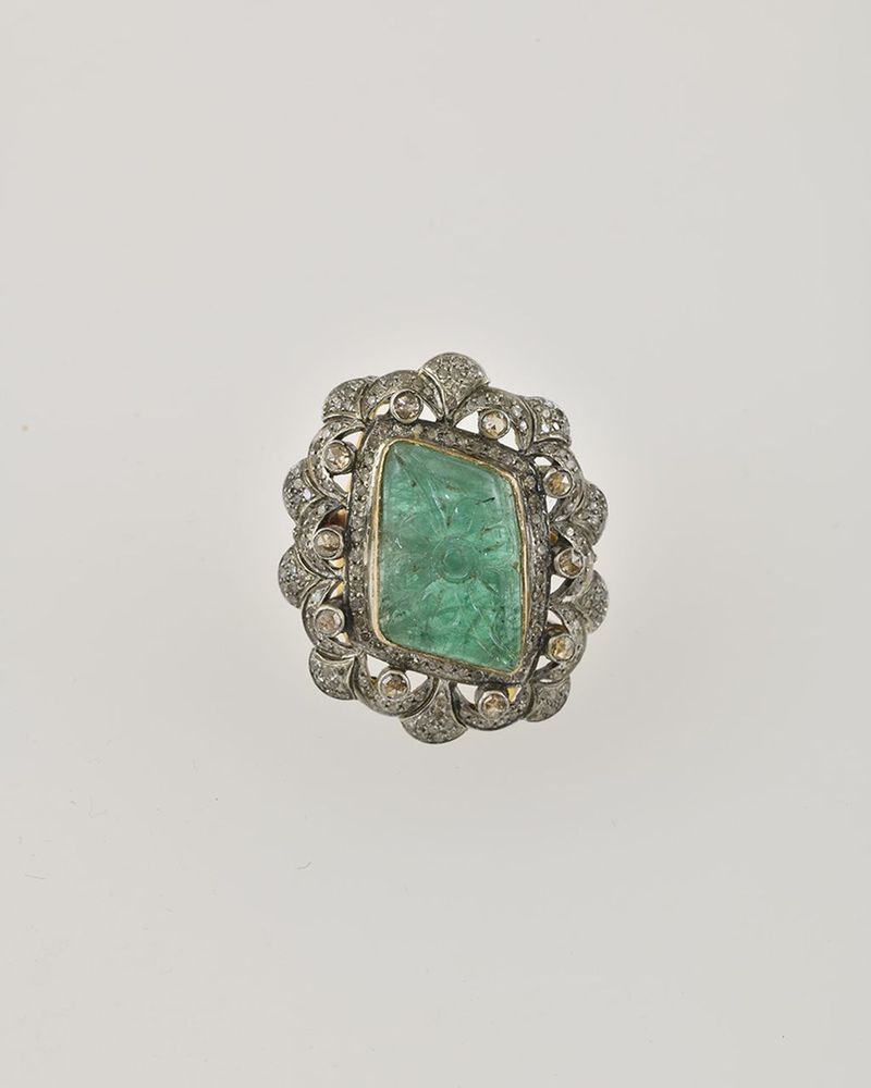 Technika: 14 k zlato, striebro, smaragd cca 12,0 ct, diamanty spolu cca 1,2 ct, 4 x 3 cm