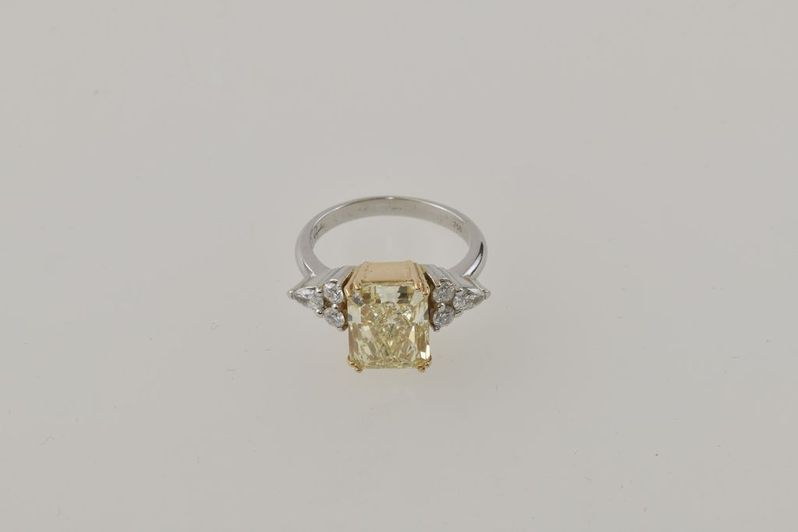 Technika: 18 k biele a žlté zlato, centrálny diamant - bagetový brus 6,02 ct, farba prírodná žltá (natural Fancy Light Yelow), čistota VVS2, bočné diamanty 6 ks spolu: cca 0,7 ct, farba E-F, čistota VVS