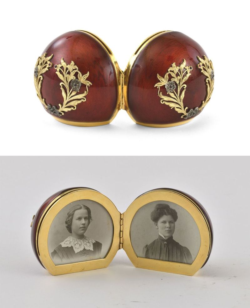 Technika: Červený email, kvetinové aplikácie zdobené rubínmi a diamantovými šplitrami