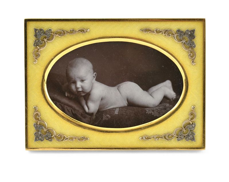 Technika: Žltý email zdobený aplikáciami z pozláteného striebra, diamantové šplitre