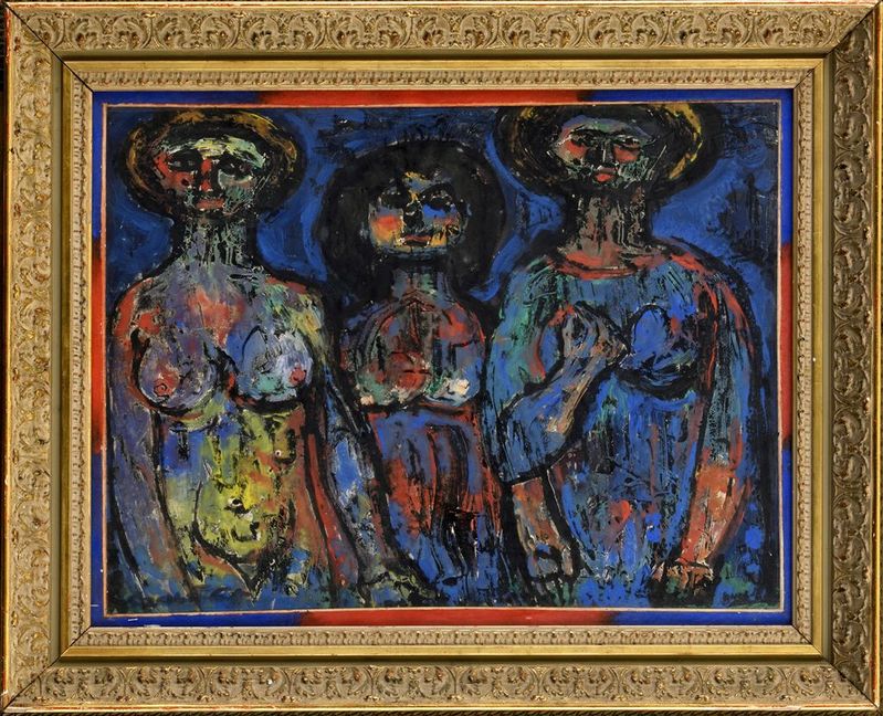 € 7 000,- Matka s dieťaťom. Okolo 1960-65. Olej, asambláž plechom na kartóne. 90 x 64 cm. (89. zimná aukcia. 1. 12. 2009)
