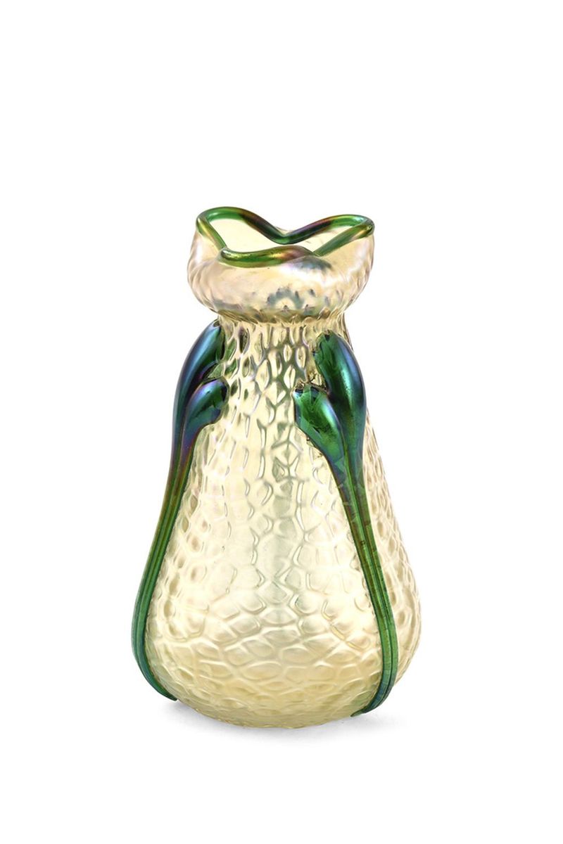 Technika: Irizované zelené sklo zdobené modrými nálepmi – Králik