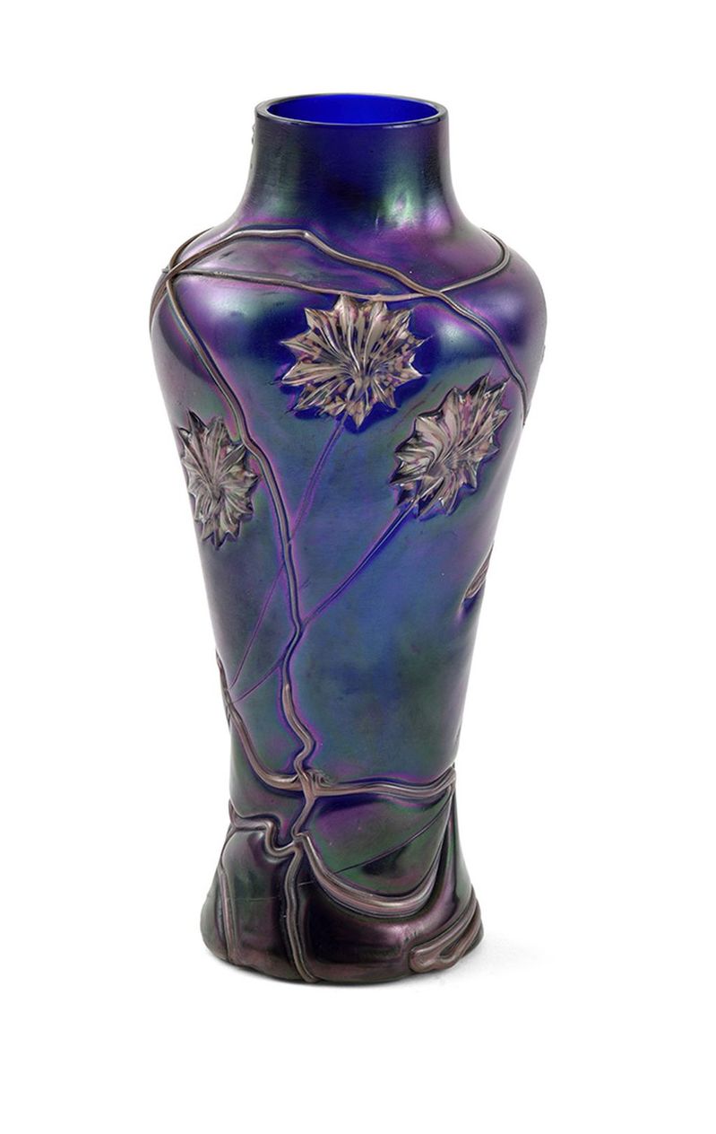 Technika: Bordovo fialové irizované sklo s kvetinovými nálepmi