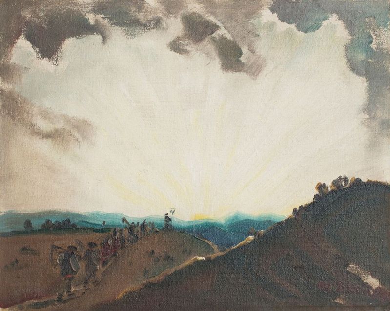 Značené: Značené vpravo dole "M. Benka," na zadnej strane: Náčrt z rána "Do práce" Liptov, M. Benka