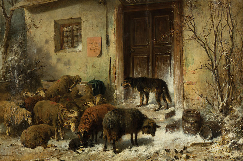 Friedrich Otto Gebler, nemecký maliar 19. storočia, odchovanec Drážďanskej akadémie, dokončil svoje štúdiá na akadémii v Mníchove pod vedením maliara historických kompozícií Karla von Pilotyho. Počiatočným záujmom autora bola historická maľba, od ktorej sa však odklonil príchodom do Mníchova. Vo svojich žánrových kompozíciách sa začal sústreďovať na zobrazenie vidieka v podobe animálnych portrétov. Hlavným námetom autorových malieb sú najmä vyobrazenia oviec, psov s občasnou figurálnou štafážou. Predkladané dielo „Ovce aj ovčiarsky pes“ z obdobia okolo roku 1870 je dokladom výnimočnej zručnosti autora pri zachytení realistického zobrazenia vidieka. Gebler unikátne pracoval so svetlom a tieňom. Jeho maľby zachytávajú pozoruhodnú atmosféru, čo podnietilo aj osobitú prácu s technikou chiaroscuro. Gebler využíval najmä odtiene hnedej farby, častokrát tmavého pozadia, ktoré kontrastuje so žiarivými lúčmi svetla prenikajúce od popredia výjavu. Analógie Geblerových žánrových motívov oviec možno nájsť v tvorbe severonemeckého maliara oviec Alberta Heinricha Brendela, ktorého Gebler technicky, kompozične a štýlovo jednoznačne prekonal.