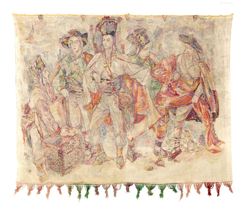 Slovenská umenoveda, spoločnosť i trh s umením majú voči Lei Mrázovej (rod. Krššákovej) obrovský dlh, ktorý by bolo načase začať splácať. Na jednej strane preto, lebo skôr či neskôr zomrie aj posledný človek, ktorý ju osobne poznal a zažil ako umelkyňu, na druhej strane preto, lebo nepoznanie jej tvorby a osobnosti ochudobňuje predovšetkým nás. Je smutné, že väčšina písomných zmienok, ktoré majú akú-takú výpovednú hodnotu o jej tvorbe a význame, pochádza zo 40. rokov (zomrela v roku 1995!), pričom si netreba predstavovať obsažné monografie, ale len niekoľkostranové úvody k albumom obrazov, resp. zopár článkov v súdobej tlači. Lea (ako sa často podpisovala na svojich dielach) nebola Prešporáčkou, do hlavného mesta sa prisťahovala až v roku 1939 a jej sľubne sa rozbiehajúcu kariéru prerušil nástup komunistickej diktatúry. Dnes už len ťažko vieme povedať, či za jej postupným vytrácaním sa z centra umeleckého diania stál násilný režim a ubúdajúce príležitosti alebo umelkynina obľuba alkoholu (možno druhé záviselo od prvého). Tvorba Ley Mrázovej a jej angažovanosť ako redaktorky (Živena) či prekladateľky vypĺňali v našej kultúre miesto patriace ženám, ktoré si svoje poslanie (vo feministickom duchu) uvedomovali, čo Lea podporovala aj svojimi vyhláseniami v tlači. Stala sa dokonca neoficiálnou portrétistkou žien v prostredí, kde bola dominancia mužov absolútna. Konštatovanie, že jej tvorbu poznáme len zbežne, je pravdivé, ale napriek tomu nám pri pohľade na jej doteraz publikované práce nemôže uniknúť akési zriedenie či rozpad farieb a tvarov na neskorých dielach oproti medzivojnovému obdobiu. Kým Mrázovej predvojnové umenie malo pomerne jasnú, sebavedomú štruktúru a do obrazov bola vmaľovaná akási neustále prítomná uvoľnenosť, jej neskoré kytice či sporadické portréty pôsobia ako nekoordinované nanášanie farieb v rôznych množstvách, pričom konečný obraz vyplynul z rutinnej činnosti, nie z umeleckého zámeru. Jej neskorá tvorba je však energická, bohatá a mala by mať svoje miesto v našich dejinách umenia. Lebo akékoľvek boli pohnútky autorky maľovať odviazane „iba“ kytice, je to svedectvo toho, na čo naša spoločnosť v danej dobe mala, akokoľvek to môže byť pre nás dnes ťaživé. Pri nedávnom preberaní jednej z autorkiných mnohých kytíc pre potreby našej on-line aukcie sa moja inak veľmi kritická (ale spravodlivá) kolegyňa Nina Gažovičová zahľadela na obraz a konštatovala, že Leine neskoré diela vlastne stačí len prerámovať do iného rámu a pozrieť sa na ne so záujmom a bez predsudkov. Je to len dôkazom, čo všetko dokáže vstupovať do vnímania diela toho ktorého autora/autorky: „dielacke“ rámy z čias socializmu nepristanú všetkým obrazom. Pomerne rozsiahly úvod som považoval za dôležitý preto, lebo bez predstavy o tom, kto Lea Mrázová bola a čo sa stalo s jej tvorbou, nie je možné pochopiť jedinečnosť gobelínu Jánošíkova družina. Toľkokrát skloňovaná heroická slovenská výtvarná moderna nemala len hrdinov, ale aj hrdinky. A Lea Mrázová jednou z nich nepochybne je. Jej zaradenie do Generácie 1909 je skôr teoretické a veľmi okrajové, omnoho dôležitejšie boli jej zahraničné školy a kontakty, ktoré dodali jej tvorbe odvahu a svojský charakter postavený na farebných plochách a škvrnách. Táto črta v jej tvorbe vydržala približne do 50. rokov a práve ponúkaný gobelín je toho dokladom. Jánošíkova družina obsahuje všetko, čo ponúkla jej včasnejšia tvorba. Možno je trocha ochudobnená o voľnosť, čo však vysvetľuje rok vzniku diela. Práve ten nám totiž môže objasniť datovanie kartónovej predlohy ponúkaného gobelínu, ktorá sa nachádza v zbierke Slovenskej národnej galérie (Jánošíkova družina, 1956, gvaš na kartóne, 206,4 x 283,6 cm, K2503), do roku 1956. O rok neskôr sa prezidentom ČSSR stal Antonín Novotný, pre ktorého kanceláriu bolo výsledné dielo zakúpené. Gobelín je vzhľadom na svoj formát i spôsob tkania majstrovským dielom, ktorého výroba bola nesmierne náročná. Už samotný fakt, že išlo o dar prezidentovi republiky, napovedá, že máme dočinenia s významným dielom od významnej autorky. (JB)