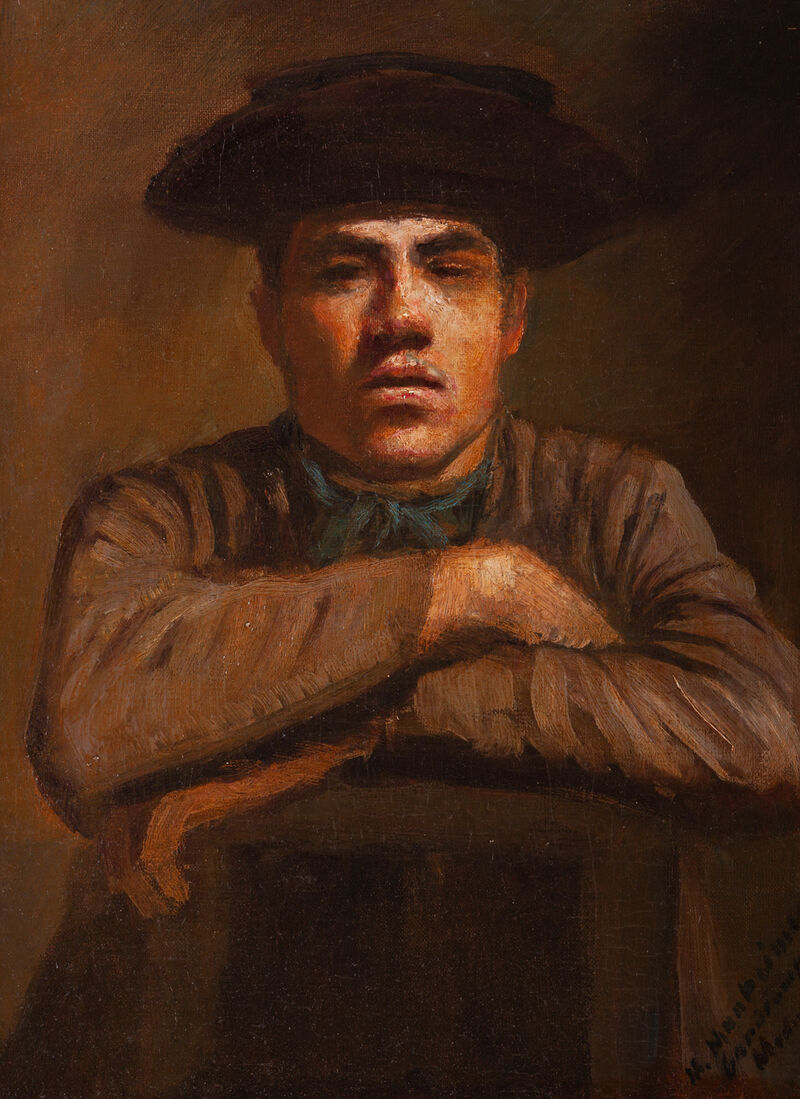 Dielo Ladislava Mednyánszkeho je jedinečné aj v medzinárodnom meradle, dokonca v širšom ako sú hranice niekdajšieho Rakúsko-Uhorska. Umelcov šľachtický pôvod je odpoveďou na mnohé otázky, no predovšetkým na tú, ktorá rieši, ako je možné, že súčasťou jeho diela sú aj obrazy, ktoré nevznikli pre trh či výstavu. Sem patrí aj množstvo olejov či kresieb zachytávajúcich „nikoho“. A práve tí z kategórie „nikto“ sú častokrát nositeľmi asi najdôležitejšej veličiny v jeho umení a myslení – sily. Sila má v Mednyánszkeho denníkoch podobu gréckej delty a v dielach mužskú/chlapčenskú tvár (postavu). Maliarova tulácka povaha, úprimný záujem o nižšie spoločenské vrstvy a túžba po kontakte s pochmúrnymi alebo výrazne duchovnými udalosťami majú za následok existenciu množstva podobizní (presnejšie podôb) paholkov, Cigánov, kočišov, beťárov či vojakov. Ale akých? I keď je pravda, že najznámejšie a najčastejšie reprodukované sú práce so značne démonickým charakterom, v ktorých sa zračia tie najnižšie pudy či ľudské zlo, maliarovi nemožno uprieť záujem o tých, ktorých výraz tváre prezrádza inú než len démonickú povahu (hlúpi, jednoduchí a pod.). Míľnikom v Mednyánszkeho živote je smrť otca a následná výstava v Paríži. Symbolistické obdobie, ktoré nasledovalo, v plnej miere čerpalo z jeho slovenských skúseností a repertoáru tvoreného podobami mládencov z okolia Popradu či Trenčína. Po Mednyánszkeho výstave v metropole Francúzska v roku 1897 umelecký kritik Adrien Remacle uverejnil mimoriadne výstižnú kritiku, ktorej najsilnejšia pasáž znie: „Aj keď to nie je ľútosť, skôr len súrodenecká zdieľnosť, čo cíti človek pri pohľade na tých chudobných diablov, tých úbohých, stratených ľudí, ktorí sú od narodenia odsúdení na biedu, zločinnosť a nemravnosť a ktorí tento svoj osud znášajú tak prirodzene, že sa človek pri pohľade na tú prostú jednoduchosť, ktorou stelesňujú Zlo, nedobrovoľne rozcíti...“ Mednyánszky pri maľovaní vychádzal z konkrétnych ľudí, ale to, čo sa snažil zachytiť, bolo univerzálne. Na predkladanom diele je v pravom rohu venovanie, z ktorého je čitateľné len „... priateľsky Mednyászky“. Na základe iných diel predpokladáme, že obraz autor venoval samotnému zobrazenému. Jeho črty, markantná tvár, prižmúrené oči, nedôverčivý pohľad či vzdorná (alebo skôr obranná) póza sú znakmi, ktoré u Mednyánszkeho predstavovali silu. Ako homosexuála, ktorý neskrýval svoju orientáciu, ho prirodzene zaujímali chlapi. Nešlo však o nič vulgárne či fyzické, práve naopak, umelec celý svoj život podriadil duchovnu a chápaniu sveta cez prizmu nefyzického, pretože telesnosť ho od detstva obmedzovala. (JB)