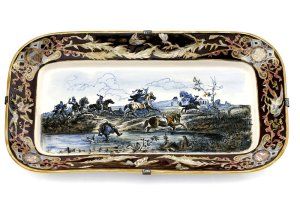 Biografia: Od roku 1881 bol Kelemen Kaldewey popri Arminovi Kleinovi najvýznamnejším designérom zsolnayskej manufaktúry. Predkladaný obdlžnikový tanier je charakteristickou ukážkou jeho tvorby. V centrálnej casti Kaldewey zvycajne maloval kobaltovou modrou žánrové scény, casto s loveckou tematikou (lov na medvede, diviaky), rytierske súboje a tanecné zábavy. S figurálnou kompozíciou obsahovo korešpondovala aj ornamentika obvodovej, casto zlátenej bordúry. Charakteristické prvky – zbrane, panciere, kvety a erby sú kombinované s rozvilinovým rastlinným ornamentom v renesancnom duchu.