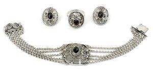 Technika: náramok, náušnice, prsten,filigrán osadený záhnedou,800 striebro