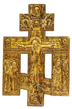 Popis: mosadzný dvojkríž s reliéfnym spracovaním ukrižovaného