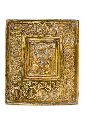 Popis: centrálne zobrazenie Archanjela orámovaného 18 medailónami s portrétmi svätých