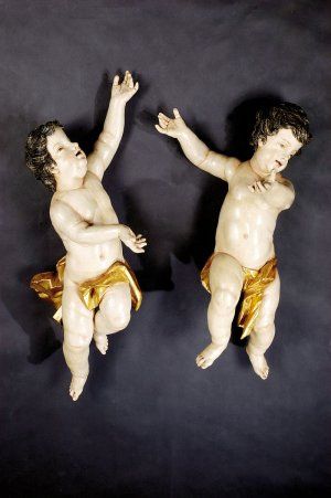 Popis: originálna polychrómia dynamické pózy oboch anjelov v drieku zahalených zlatou drapériou inkarnáty sú rozmaľované v ružových farebných tónoch, typických pre túto umeleckú epochu