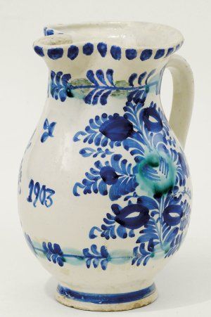 Popis: pálená glazovaná hlina, modro-zelený rastlinný dekor na bielom podklade