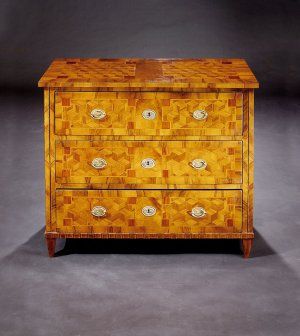 Popis: trojzásuvková komoda s orechovým dyhovanímjavorová marketéria, kovanie