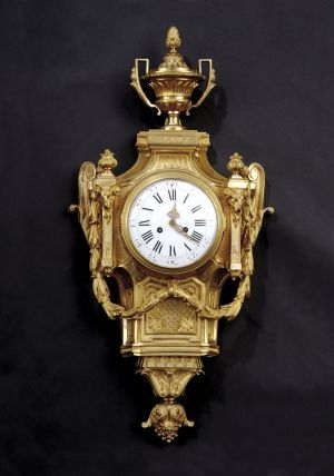 Popis: ohňom zlátený bronzový korpus v tvare symetrickej architektúry klasicistický štýl striedanie rôznych florálnych prvkov (akantove listy, girlandy ) dva frontálne stĺpy zdobia hlavy baranov horná časť ukončená vázou s dvoma ušami a palmetami biely emailový ciferník s rímskymi hodinovými číslicami a latinskými minútovými číslicami