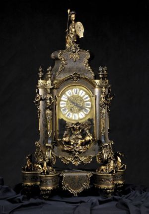 Popis: Bohato členená architektúru korpusu, je zdobený plasticky modelovanými alegóriami Samostatná skrinka hodín stojí na 4 ležiacich koňoch 4 kariatídy držia na hlavách symsovanie s vázami korunu zdobí socha Palas Atény reliéfne zdobený ciferník je doplnený emailovými kartušami rímskych číslic