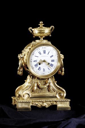 Popis: korpus ohňom zlátený bronz po stranách levie hlavy, držiace v papuli previazanú drapériu, vo vrchnej časti sa nachádza váza s akantovým dekorom biely emailový ciferník s rímskymi číslicami stroj značený "J.HANSSENS PILS - BRUXELES"