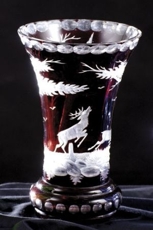 Popis: číre a rubínové vrstvené skloplastický dekor s motívom krajiny so zvieratamivýška 26 cm
