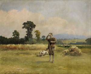 95 000,- Sk Zimná krajina (Poľovačka). Okolo 1905. Olejová tempera na papieri. 47 x 68 cm. (23. zimná aukcia, 5. 12. 2000)