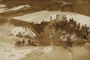 Technika: lavírovaná kresba hnedým tušom na papieri