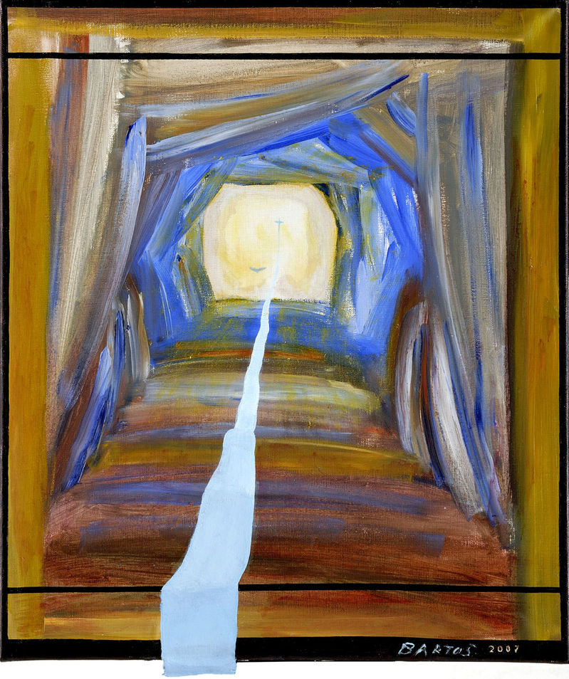 Popis: "Z hmly sveta k svetlu" a "Dráha k svetlu" predstavujú najnovšiu maliarsku tvorbu vedúcej osobnosti slovenského konceptuálneho umenia Petra Bartoša. Narodil 29. 4. 1938 v Prahe. 1955-60 študoval na Strednej škole umeleckého priemyslu v Bratislave (prof. Chovan, Fikari), 1960-66 na Vysokej škole výtvarných umení v Bratislave (prof. Želibský, Mudroch, Matejka). Manifestačne sa rozlúčil s tradičnou maľbou akciou "Rozdávanie", ktorú zorganizoval v škole na Gorazdovej ulici v Bratislave (1965). 1967 spoluusporiadal s Júliusom Kollerom, Michalom Studeným a i. v Galérii Saloonik - Medzivýstavný polemický priestor. Paralelne s týmito aktivitami sa zaujíma o koncentrácie hmoty (1966), ich osamostatnenie alebo zabalenie (1967), od týchto prác prechádza ku konceptuálnym textovým oznamom a náčrtom. Z literatúry: 20. storočie, kat. výstavy, SNG Bratislava, str. 77; Matuštík, R.: ... Predtým. 1964-1971. Prekročenie hraníc. Považská galéria umenia. Žilina 1994.