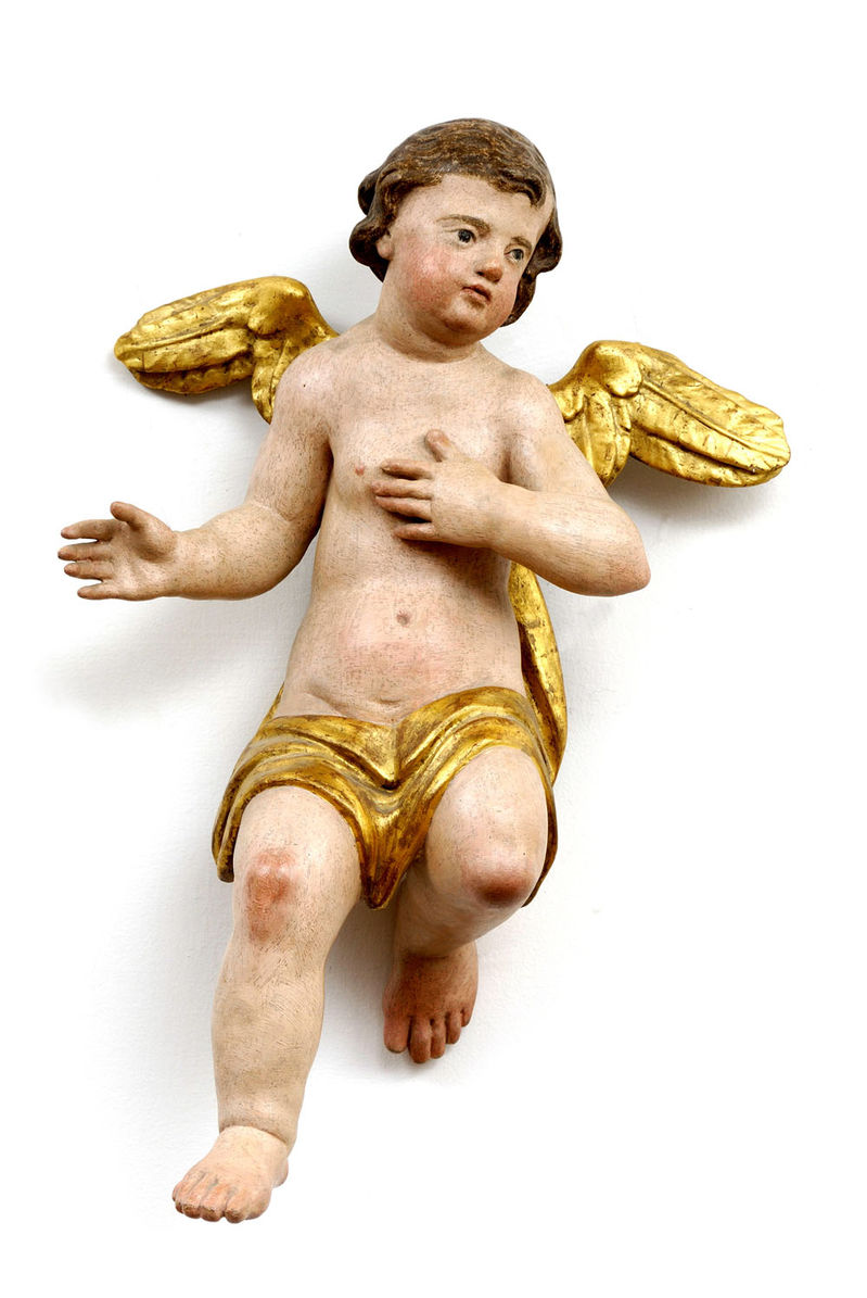 Popis: okolo 1730 neznámy stredoeurópsky rezbár polychrómované drevo, socha anjela zachytená v dynamickej vznášajúcej sa póze, drapérie zlátené, reštaurované