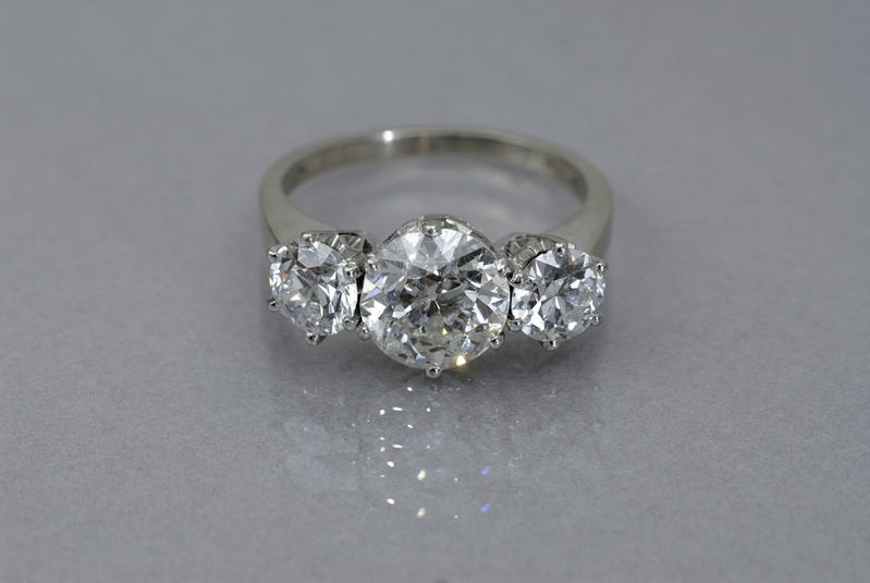 Popis: Art Deco 1920 prsteň z bieleho zlata z troma diamantmi diamant v strede osadený v šiestich krpaniach po bokoch z každej strany diamant takisto osadený v šiestich krpaniach centrálny diamant 2,5 ct starý brus menší diamant 0, 8 cts zlato 18 k puncované na obrúčke