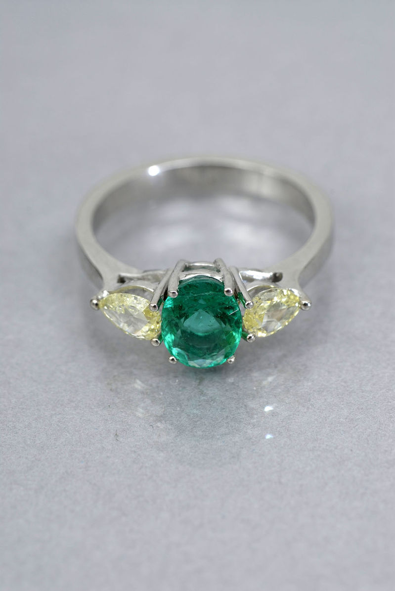 Popis: prsteň z bieleho zlata s centrálnym smaragdom a dvoma diamantami, osadenými v krpaniach smaragd cca 7,94/6,00 mm, oválny výška 4,36 mm, váha cca 1,21 ct kvalita: veľmi dobrý smaragd 2 diamanty-trillant, cca 6/4 mm váha spolu 0,42 ct kvalita: natural fancy yellow (prírodne žltý) zlato punc 750 (18 k) celková váha šperku 4,65 g poznámka: priložený mineralogický posudok