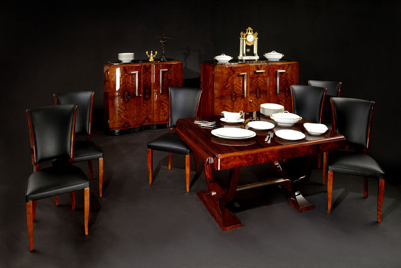 Popis: 1930 Nemecko stolová doska na nohách vo forme písmena U po stranách zásuvky, dyhované v kombinácii orechového a tropického (amboinového) dreva 6 ks stoličiek v podobnej kombinácii, čalúnené v čiernej koži