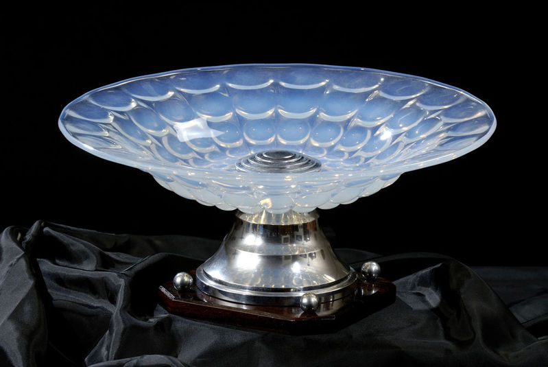 Popis: Art Deco 1930Francúzskosklenený na štvorhrannompodstavci z makasarového drevapochrómovaná noharozmer : v 15 cm, priemer 32 cm