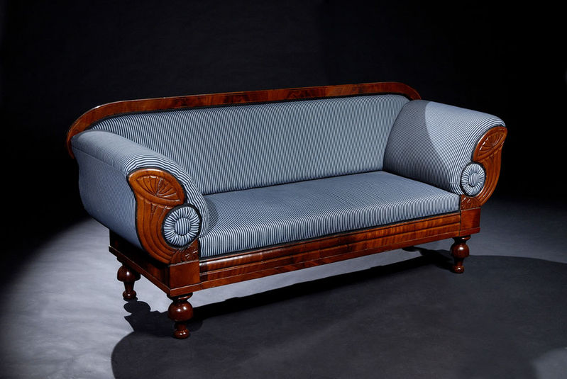 Popis: okolo 1930sofa biedermeier z ohýbaného ihličnatéhodreva, dyhovaná mahagónom, čalúnená